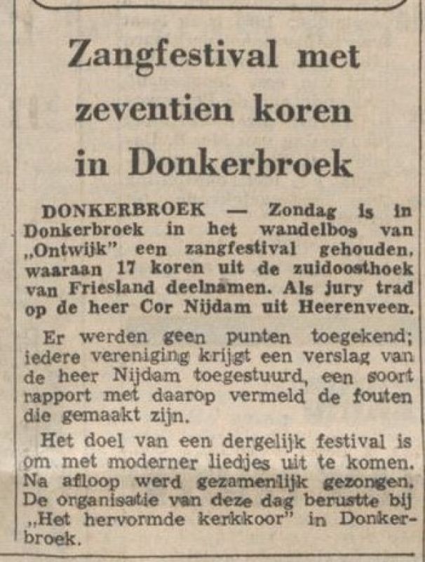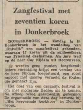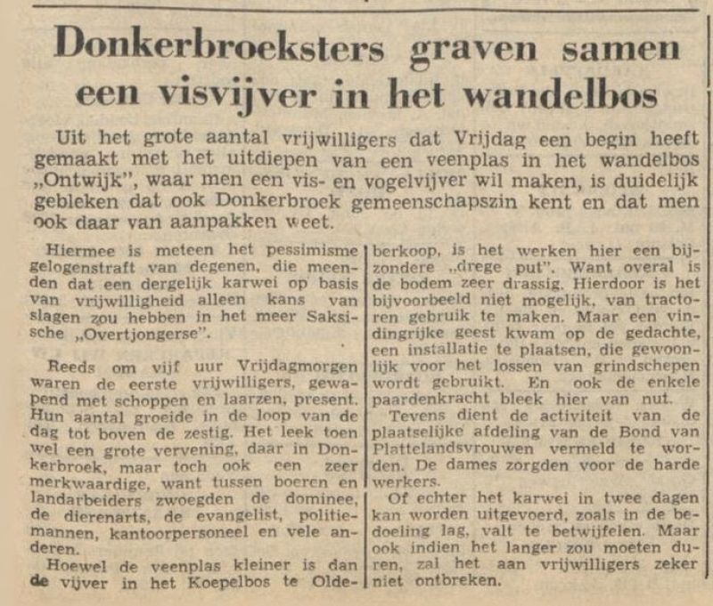 Toen de Vereniging tot behoud van Natuurschoon in 1953 25 jaar bestond kwam er een initiatief om de in het bos aanwezige bosvijver uit te diepen. Maar liefst meer dan 60 vrijwilligers variërend van dominee tot politieman, kantoorpersoneel, dierenarts en vele anderen melden zich met schep in het bos om de klus te klaren. Het bleek een ‘drege put’ maar eensgezind werd de klus geklaard en waren de Donkerbroekemers trots op hun eigen vis- en vogelvijver in de Wandelbos.