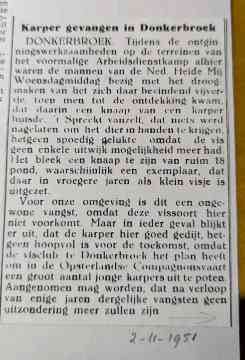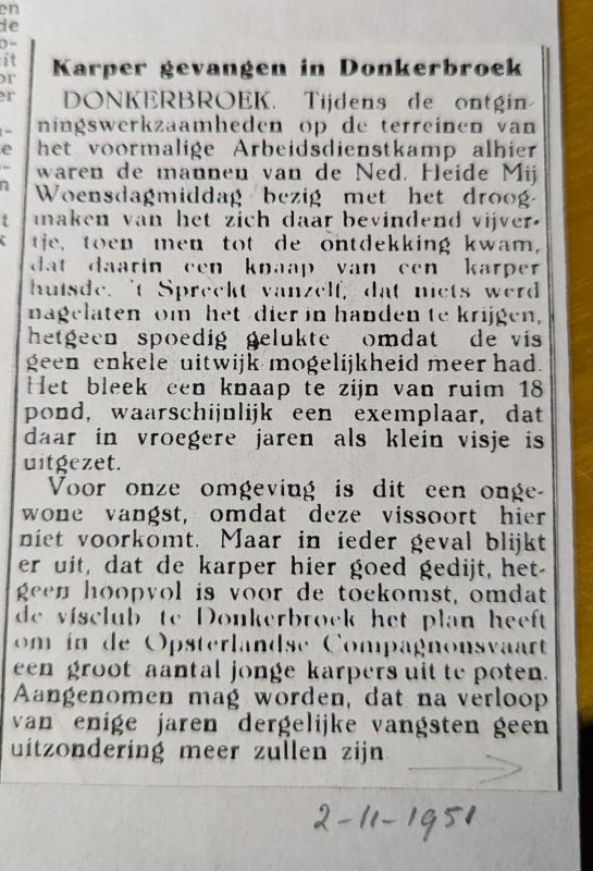 In 1951 werd de nog aanwezige vijver gedempt door medewerkers van de Heidemaatschappij. Tijdens het dempen trof men een knaap van een karper aan die waarschijnlijk tijdens de kampperiode als klein visje was uitgezet. Het was voor deze omgeving een dermate ongewone vangst dat er op 2 november 1951 een artikeltje over in de krant verscheen.