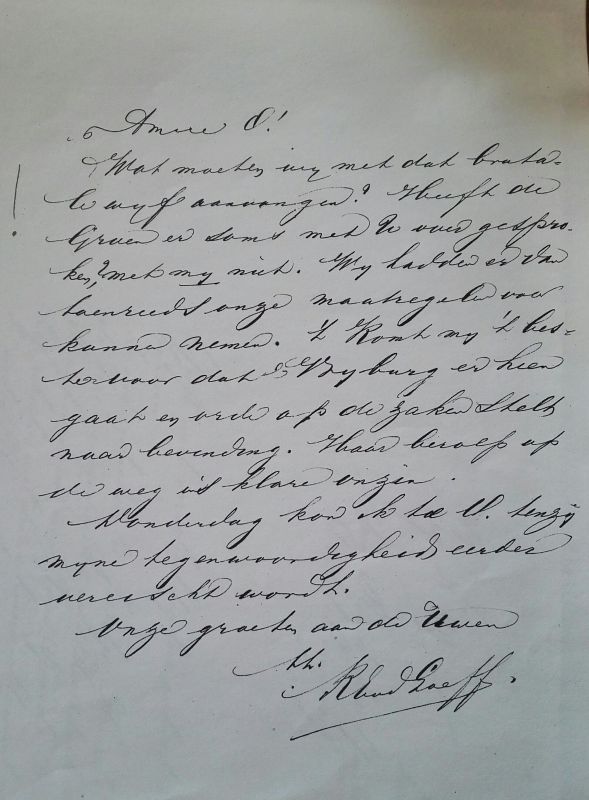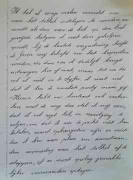 >>>>Wat moeten wij met dat brutale wijf aanvangen ? Heeft De Groen er soms met u over gesproken, met mij niet. Wij hadden er van toen reeds onze maatregelen voor kunnen nemen. ‘t komt mij het beste voor dat Vrijburg er heen gaat en orde op de zaken stelt naar bevinding. Haar beroep op de weg is klare onzin. Donderdag kom ik tot u, tenzij mijn aanwezigheid eerder vereist wordt.